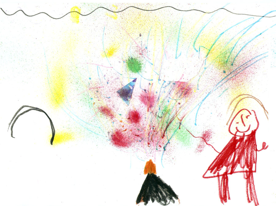 Der Vulkan wurde von dem Mädchen angezündet und jetzt sprüht er in allen Farben.