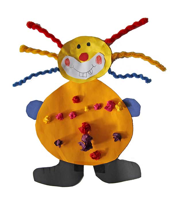 Clown, gebastelt aus farbigem Papier und Pfeiffenputzer.