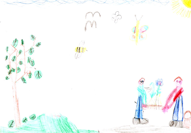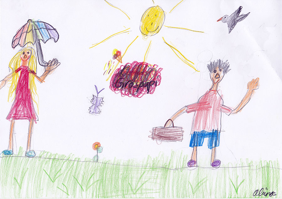 Zwei Leute - Frau mit regenbogenfarbenen Sonnenschirm und Mann mit Picknick-Korb. Diese Zeichnung hat Alina mit 8 Jahren gemalt und ihrem Grosspapa zum Geburtstag geschenkt.